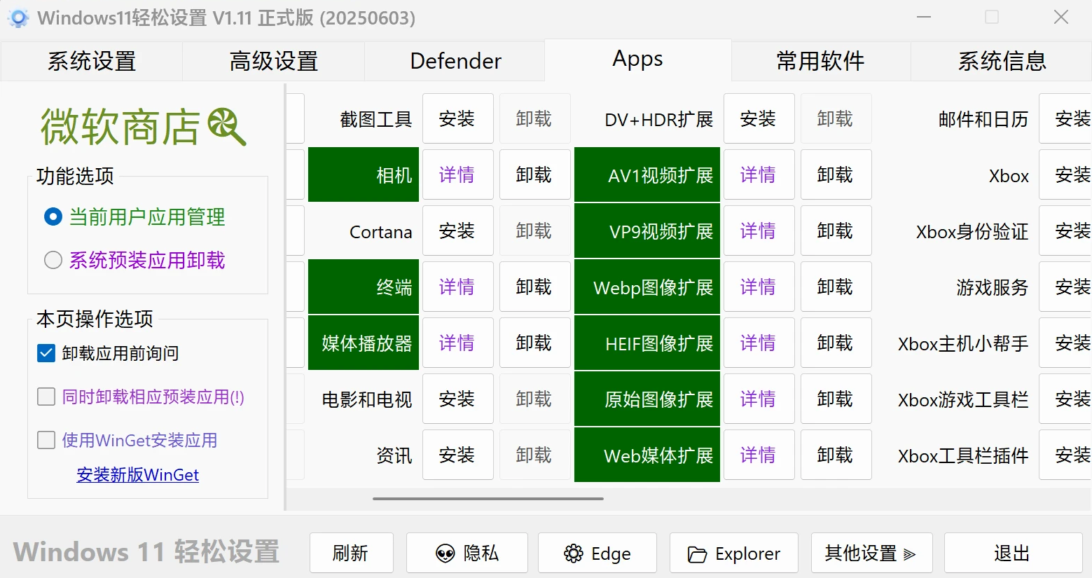 5、选择要卸载的系统自带应用或要安装的常用软件,执行相应操作。
