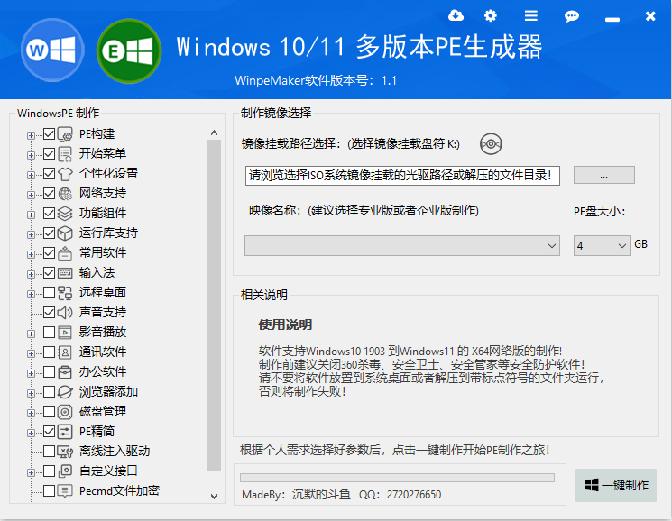 3、一键式操作:选择镜像路径后点击制作,即可完成PE生成,支持虚拟光驱挂载ISO文件。