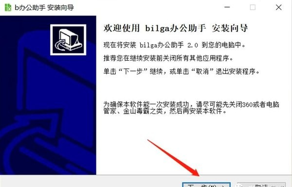 1、在本站下载bilga办公助手,打开安装程序,点击下一步。