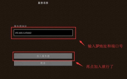 3、随后要加入的玩家输入主机的地址加上端口号就可以进行联机了。
