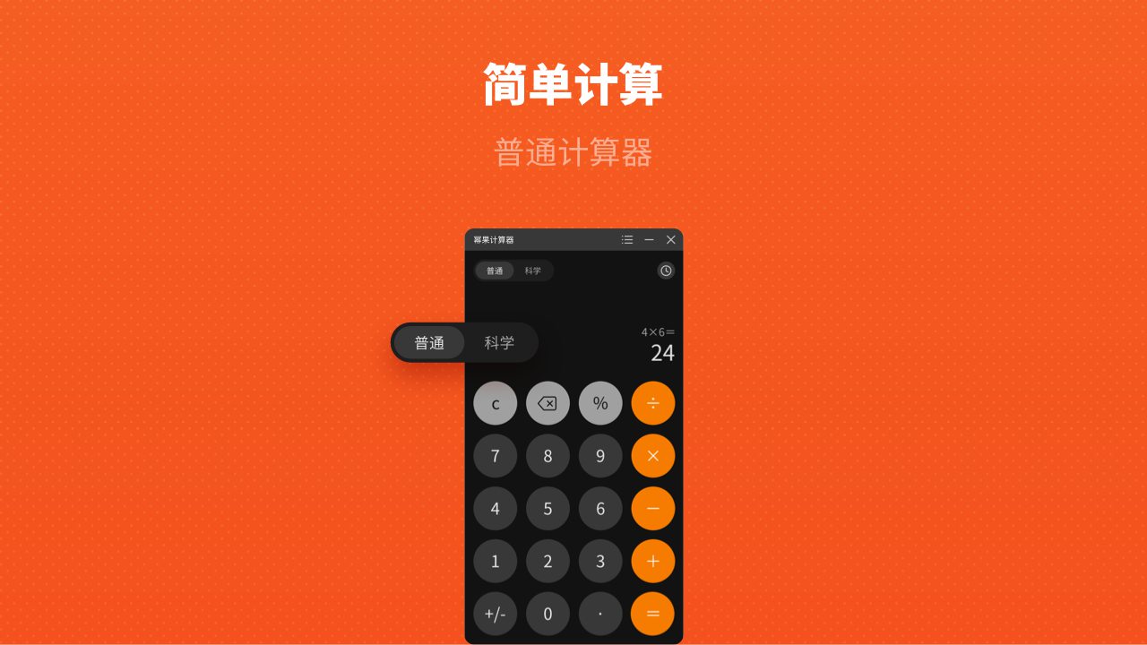 1、拥有普通和科学两种模式,普通模式就是简单的加减乘除运算。