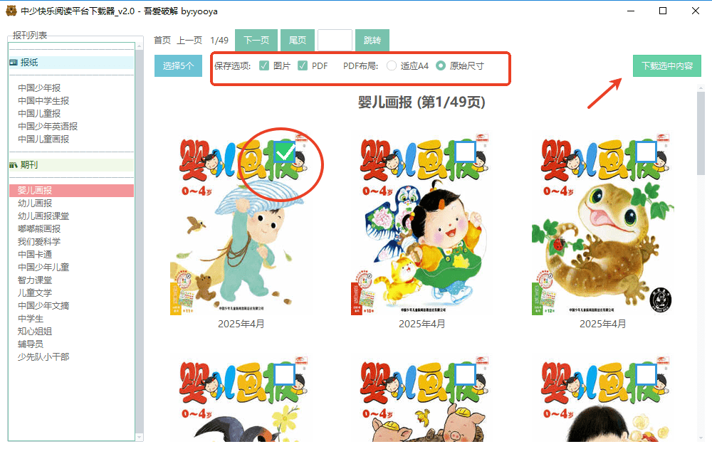 1、在本站下载中少快乐阅读平台下载器免登陆版,打开软件,选择要保存选项和PDF布局,选择下载文件,点击下载选择内容。
