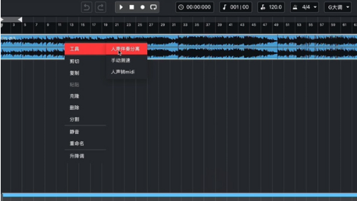 1、首先我们选择需要分离的音频片段,选择人声伴奏分离。