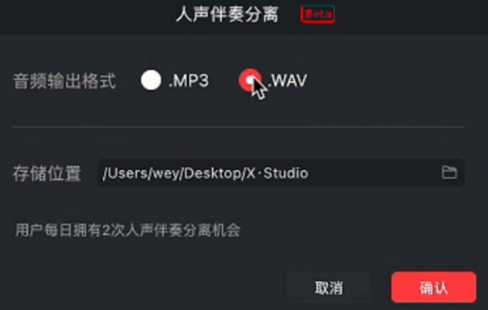 2、接着在需要输出的音频格式并设置存储位置,点击确定分离进程就会开始。